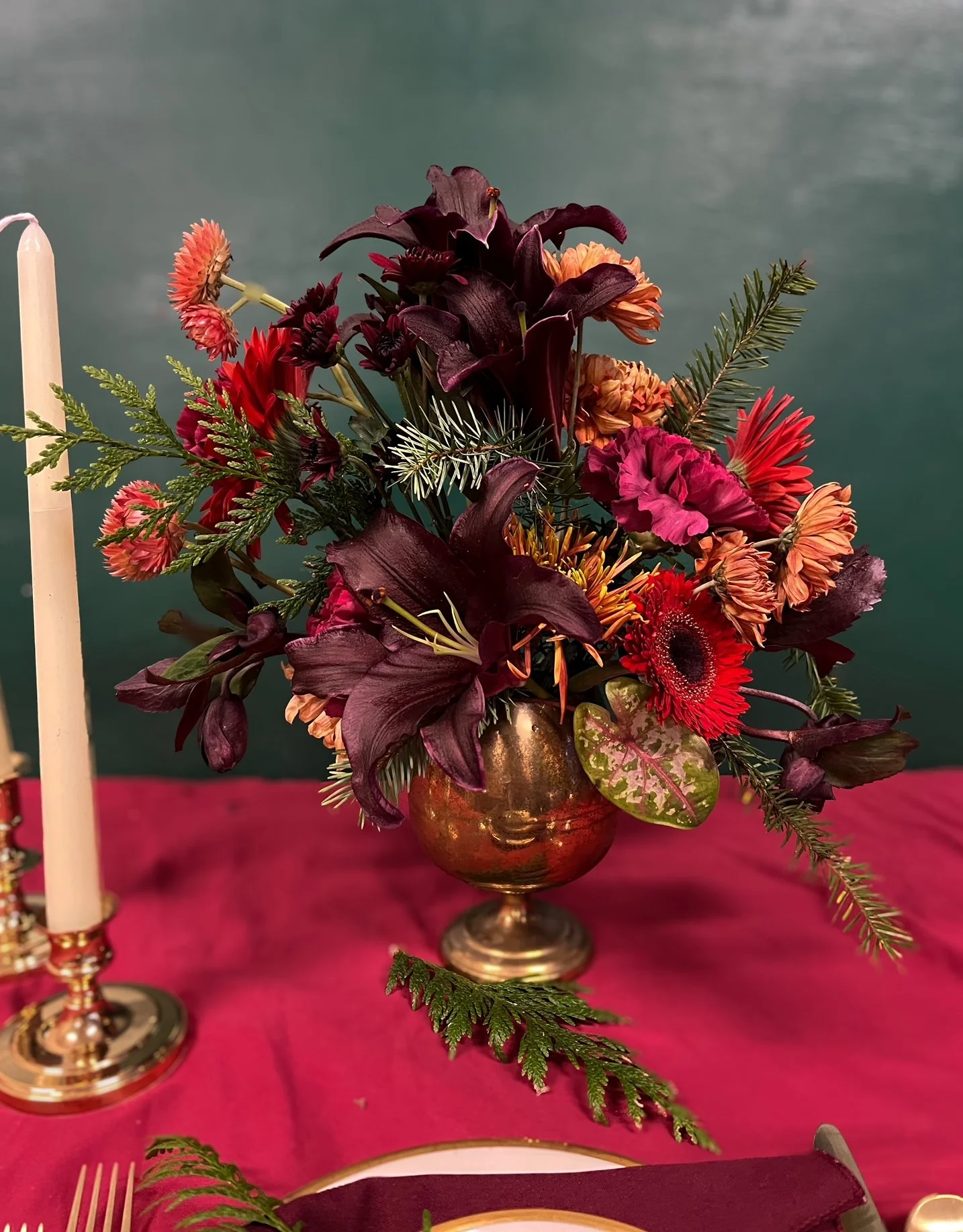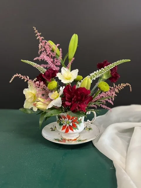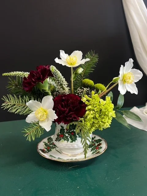 These sweet petite floral arrangements are designed in an upcycled holiday inspired teacup and full of locally and ethically foraged greens with seasonally available blooms freshly chosen from the market. Send a dainty floral arrangement to that family member that could use the extra cheer!